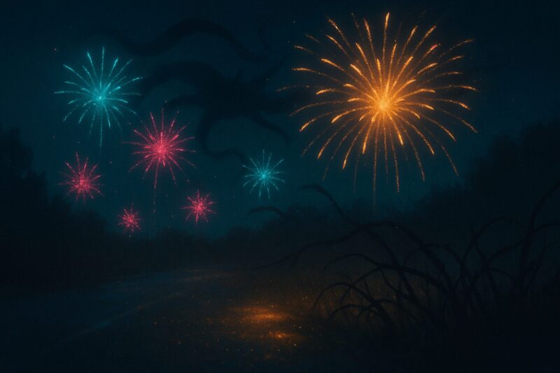 夏祭りの光が反射し、花火が炸裂し、